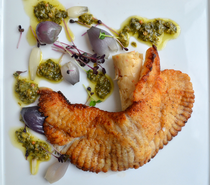 Local Skate Wing, Crayfish and Scallop Sausage, Sauce Vierge